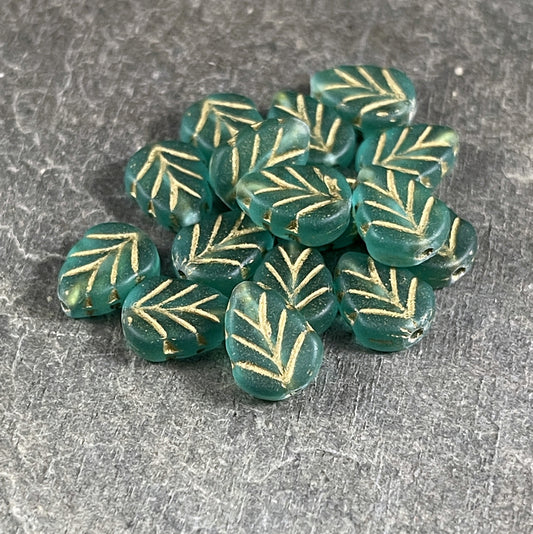 10x8mm Matte Aqua Czech Glass Bead, Aqua with Gold Wash, Center Drilled Blue Green Leaf Bead (Mint25) * Qty. 16