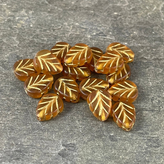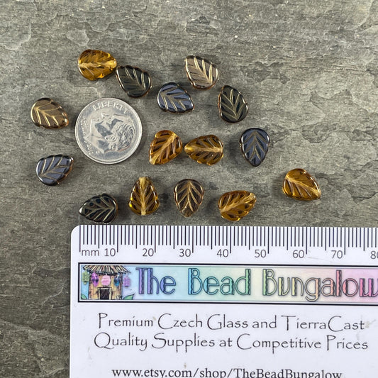 10x8mm Brown Czech Glass Leaf Beads, Honey Gold Leaf with Metallic Gold and Bronze Half Coat (Mint18) * Qty. 16