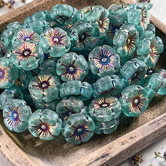 Czech Glass - 12mm Hibiscus Flower, Matte Teal with Rainbow AB Finish (FL12/N-2048) * Qty. 6