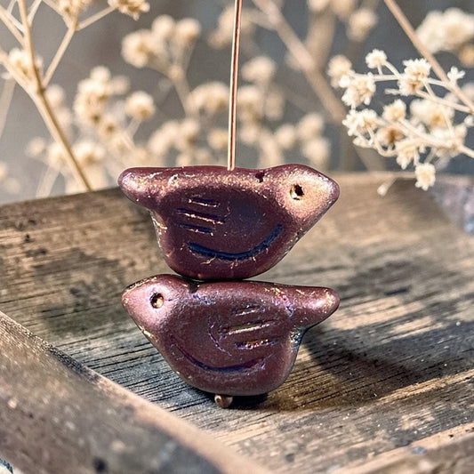 Czech Glass Beads - 11x22mm Chunky Bird, Dark Plum with Iridescent Wash (N-0563) * 3 Beads