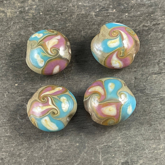 Lampwork Beads, Mauve Pink, Sky Blue and Cream with Gold Marble, 18-20mm Lentil Shape Glass Beads * Qty. 3