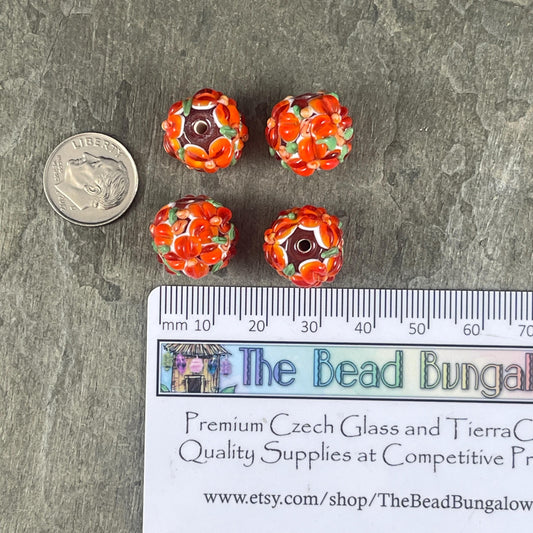 Floral Design Orange Lampwork Beads, 14mm Round, Bright Dark Orange Flower Beads * Qty. 2