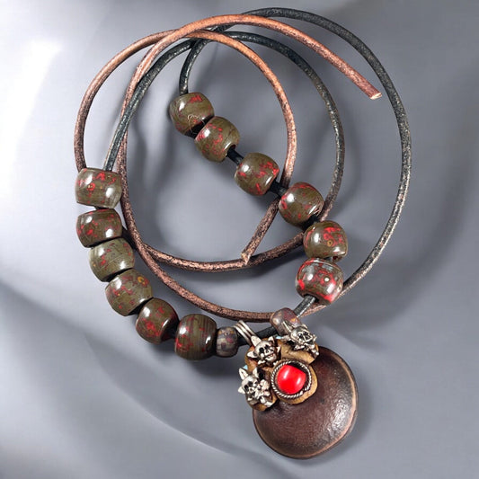 Leather Pendant with Skulls, Unique Pendant with Metal Skulls and Bead Accents, Includes Leather cord and Aged Picasso Beads