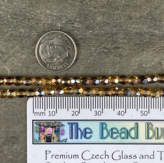 Transparent Gold Czech Glass Beads, 4mm Faceted Round Fire Polished Beads - Light Topaz Celsian, Champagne Gold (FP4/SM-Z1002) * Qty. 50