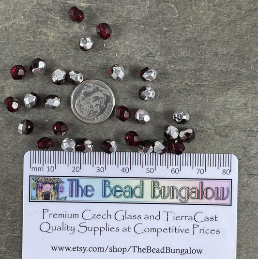 Transparent Ruby Red and Silver Half Tone Czech Beads, 6mm Czech Glass Fire Polished Round Beads (FP6/9010-27001) * Qty 50ds - Ruby Red and Silver (FP6/9010-27001) * Qty. 50