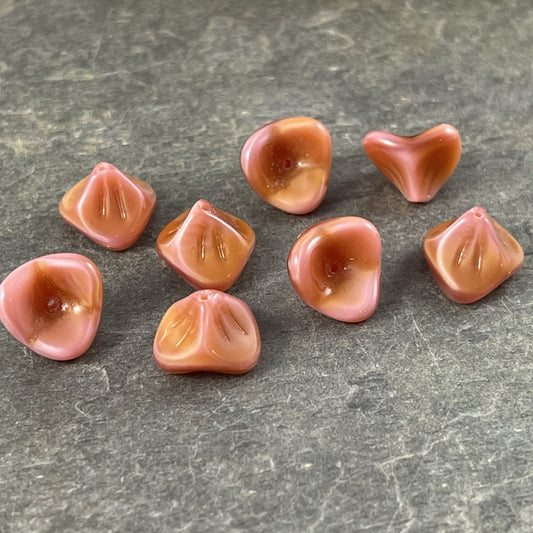 Czech Glass Beads - Peach Silk Flower, Amber Pink 3-Petal Flower, 12x9mm Peachy Pink Bell Flower Bead (FLLB/RJ-1043) * Qty. 12