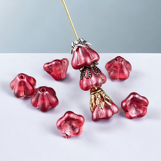 Czech Glass Flower Beads - Raspberry Pink Bell Flower, 6x8mm Berry Pink Flower Beads, Dark Pink Coated Glass Flower (BF/SM-K3712) * Qty. 25