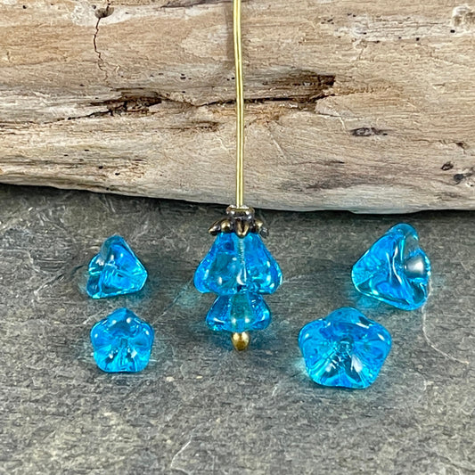 Small Aqua Czech Glass Bell Flower ~ Transparent Aqua Blue Glass Flower Beads (FL/6002) *