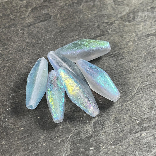 Czech Glass Beads - 20x9mm Transparent Light Gray Elongated Spindle Bead, Etched Glass with AB Finish (RHO/N-1882) * Qty. 6 Beads