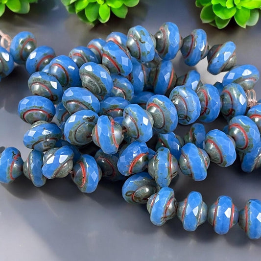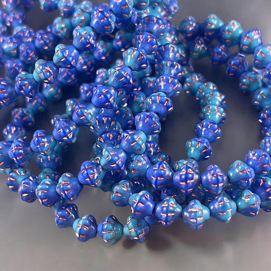 Blue 8x6mm Bicone, Czech Glass Beads, Cornflower Blue with Rustic Picasso (SAT/N-1074) * Qty. 15