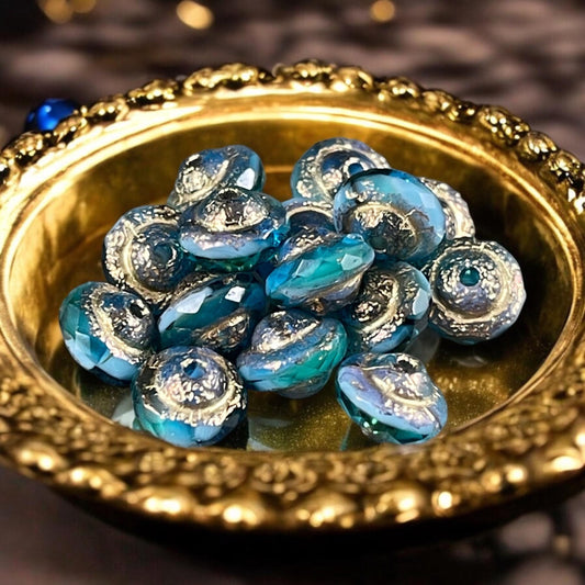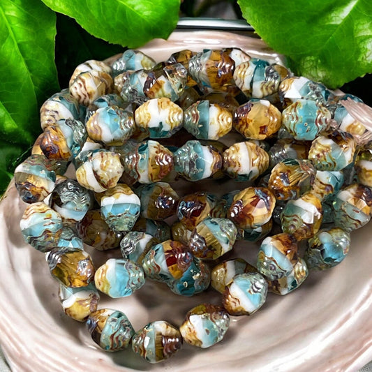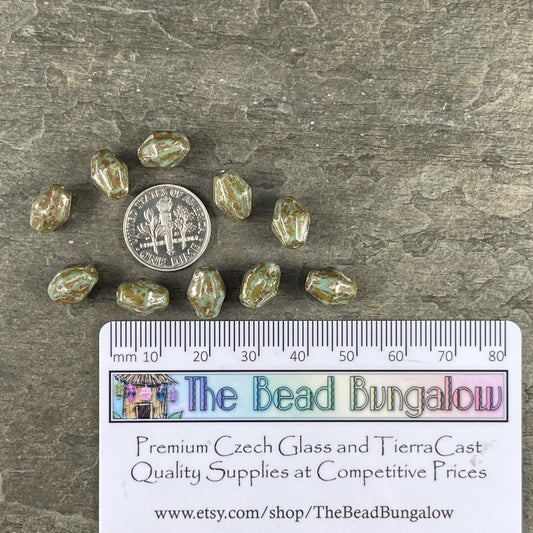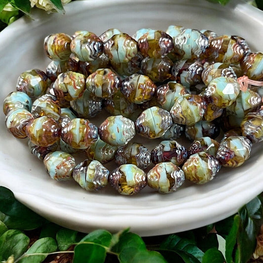 Czech Glass Beads, 10x8mm Bicone Beads, Turquoise with Silver Picasso Finish (BIC10) * Qty. 12