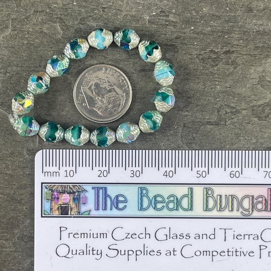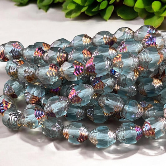 Czech Glass Beads, Cathedral 8x6mm Carved Oval Bicone, Sky Blue and Sea Green Glass Beads with AB Finish (CTD/N-045) * Qty. 15