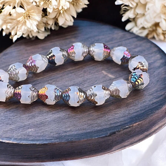 Czech Glass Beads, Cathedral 8x6mm Carved Oval Bicone, Milky White with Rainbow Metallic Finish (CTD/N-054) * Qty. 15
