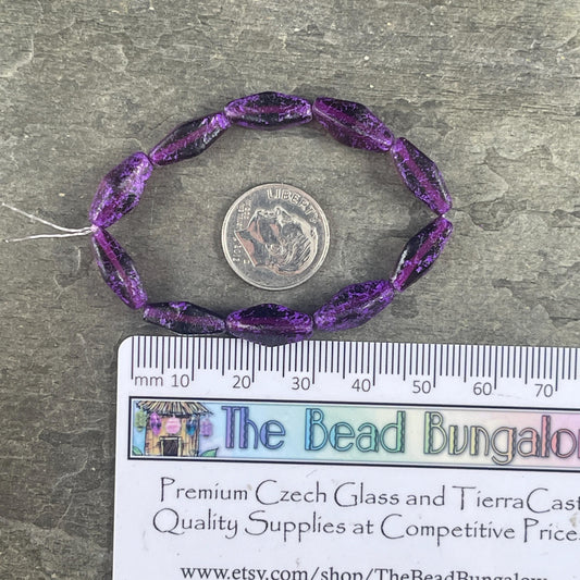 Czech Glass Beads - 14x7mm Rhombus Beads, Dark Purple Etched Glass with Purple Wash (RHO/N-2103) * Qty. 10 Beads