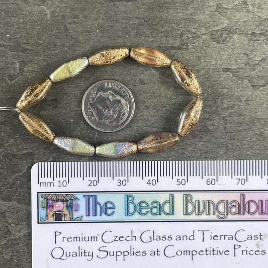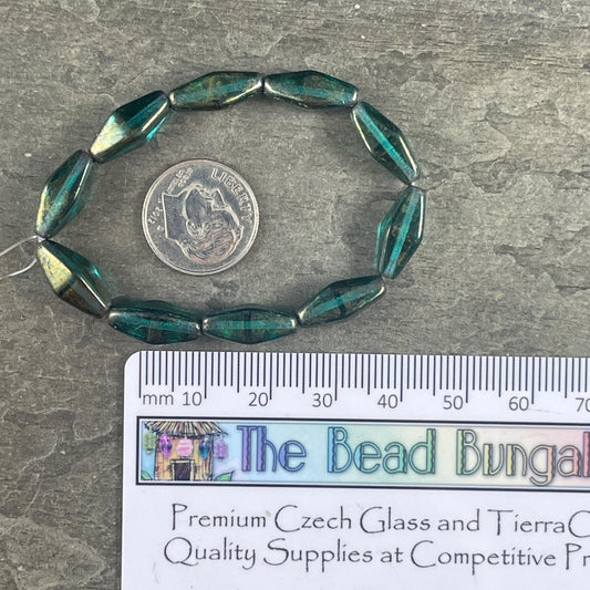 Czech Glass Beads - 14x7mm Rhombus Beads, Transparent Emerald Green with Golden Luster (RHO/N-1073) * Qty. 10 Beads