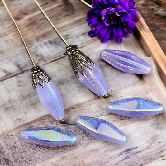 Czech Glass Beads - 20x9mm Thistle Purple Rhombus Beads, Light Purple Elongated Spindle with AB Finish (RHO/N-1874) * Qty. 6 Beads