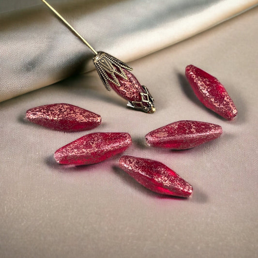 Czech Glass Beads - 20x9mm Red Rhombus Beads, Elongated Spindle Beads, Etched Red Glass with Copper Finish (RHO/N-1879) * Qty. 6 Beads