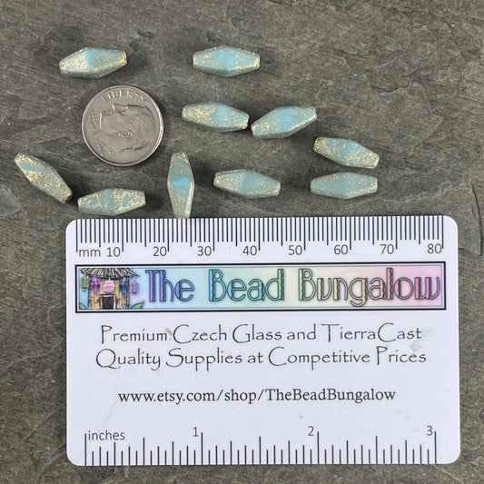 Czech Glass Beads - 14x7mm Rhombus Beads, Sky Blue with Etched and Gold Finishes (RHO/N-0790) * Qty. 10 Beads