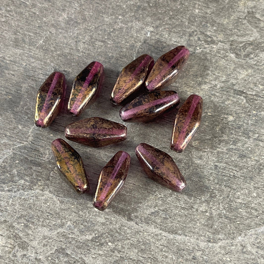 Czech Glass Beads - 14x7mm Rhombus Beads, Dark Amethyst with Marbled Bronze Luster (RHO/N-0727) * Qty. 10 Beads