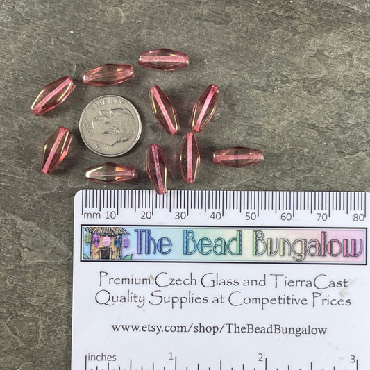 Czech Glass Beads - 14x7mm Rhombus Beads, Transparent Rose Pink with Gold Luster (RHO/N-0758) * Qty. 10 Beads