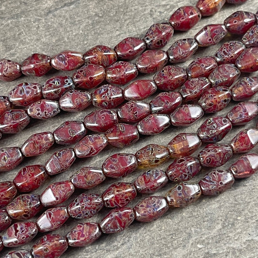 Transparent Crystal Red with Travertine Picasso , 8x6mm Dark Red, Rustic Picasso, Elongated Bicone (EB5) * Qty. 16