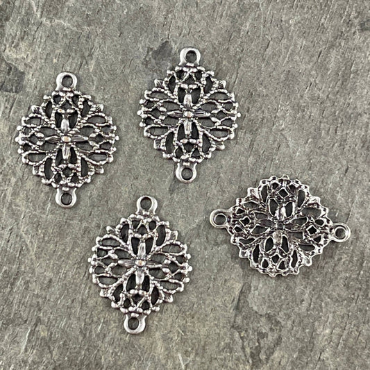 Silver Floral Themed Filigree Link - 13mm Delicate Filigree Connector, Oxidized Silver Plated Brass (A714) *Qty. 4