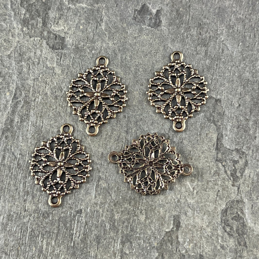 Antiqued Copper Floral Themed Filigree Link - 13mm Delicate Filigree Connector, Oxidized Copper Plated Brass (L120) * Qty. 4