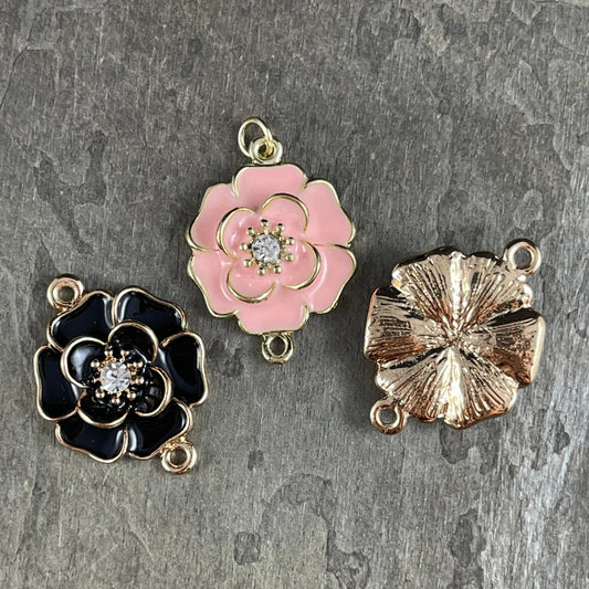 Enamel Floral Connector Links ~ Pale Peachy Pink, Black or White and Gold 25x34mm Connector with Rhinestone Center * Qty. 1
