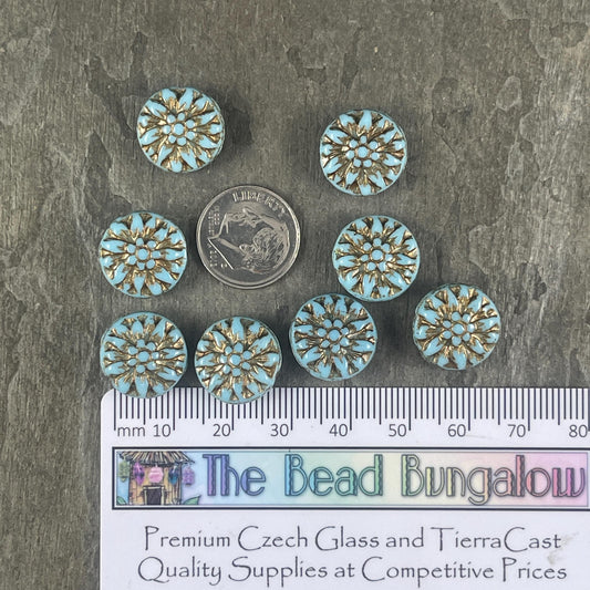 Czech Glass Beads - 8.5mm Aqua Green Flower Bead, Light Blue Green with Gold Wash (PTB3) * Qty. 16