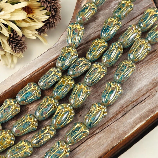 Czech Glass Beads - Capri Blue Lily Bud Beads, 12x8mm Transparent Capri Blue with Travertine and Gold Wash (LBud47) * Qty. 12