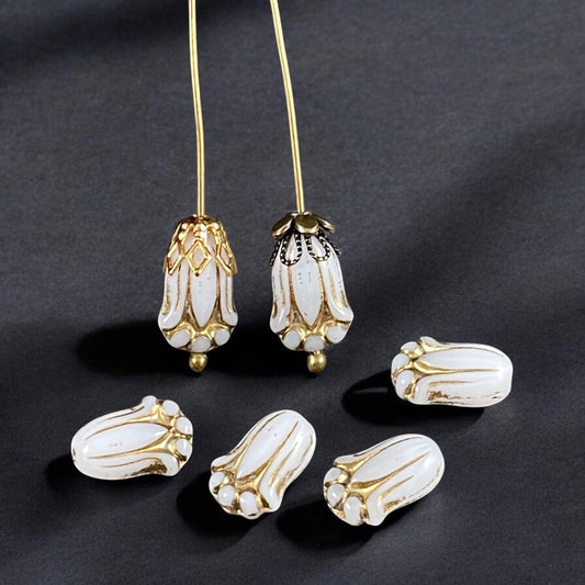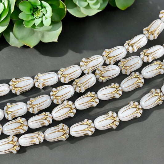 White Lily Bud Beads, Czech Glass Beads, 12x8mm Opaque Alabaster White with Gold Wash (LBud9) * Qty. 12