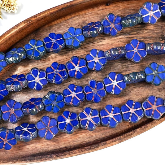 Czech Glass Beads - 10mm Dark Blue Flower, Opaque Cobalt Blue with Travertine Picasso Finish (TCFMN-36) * Qty. 15