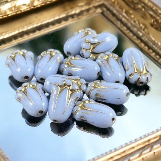 Opaque Light Blue Flower with Gold Wash, Czech Glass Beads, 12x8mm Lily Bud Flower, Light Blue Czech Flower Bead (LBud26) * Qty. 12