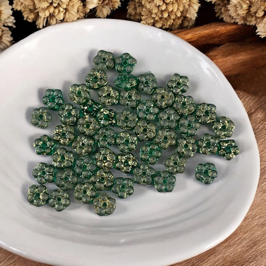 Czech Glass Beads, Forest Green Glass Spacer - 5mm Flower Spacer Beads, Dark Green Etched Glass Spacer (FMN/N-0218) * Qty. 50