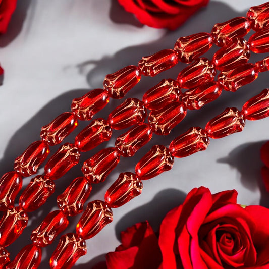 12x8mm Transparent Reddish Orange Lily Bud Czech Glass Flower Beads, Red Flower with Copper Finish (LBud48) * Qty. 12