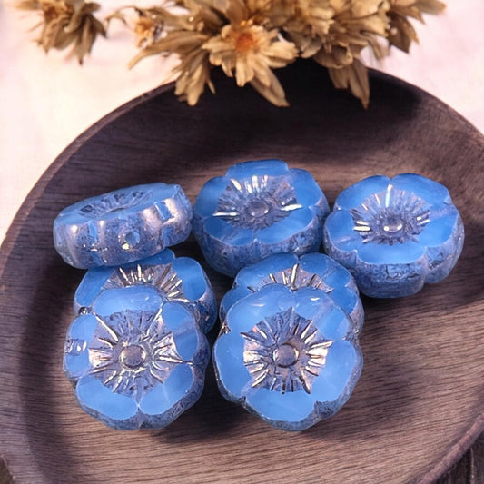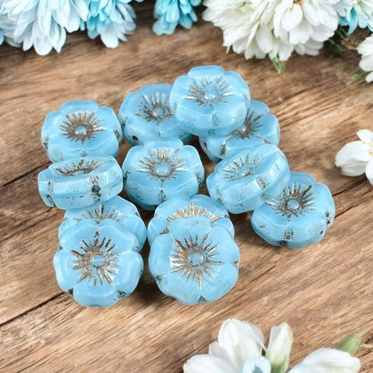 Czech Glass Beads - 12mm Light Blue Hibiscus Flower Beads ~ Baby Blue Silk Glass with Gold Wash (FL12/RJ-1144) * Qty. 6