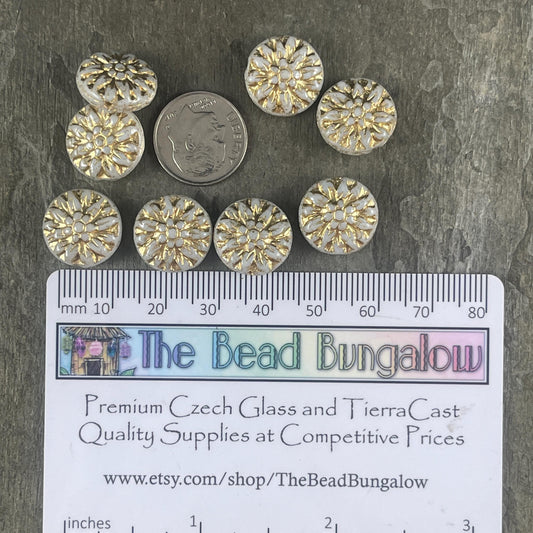14mm Czech Glass Dahlia Flower Beads - Ivory White and Gold Flower (FL14/RJ-5140) * Qty. 8