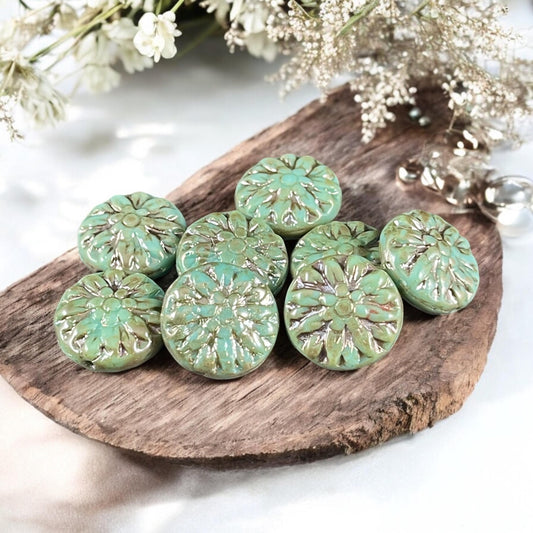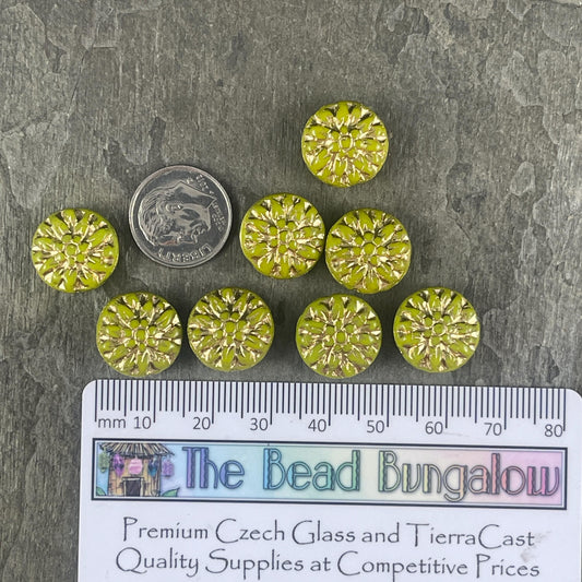 14mm Czech Glass Dahlia Flower Beads - Avocado Green Flower with Gold Wash (FL14/RJ-5139) * Qty. 8