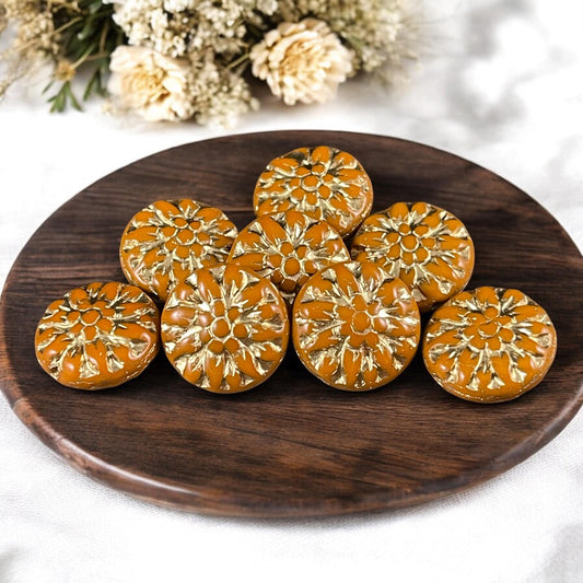 14mm Czech Glass Dahlia Flower Beads - Ochre Orange Flower with Gold Wash (FL14/RJ-5141) * Qty. 8