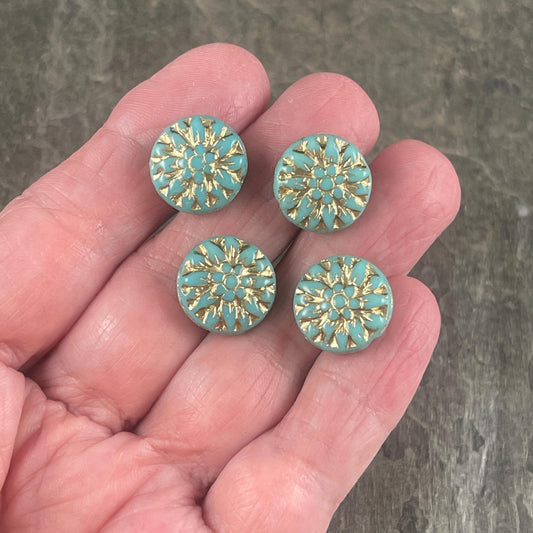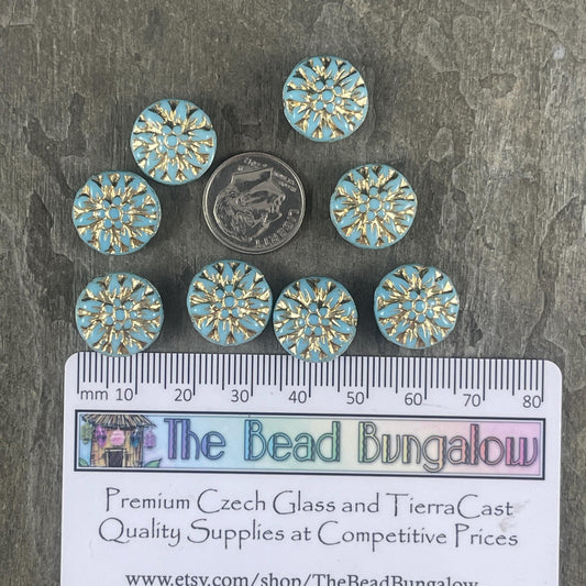 14mm Czech Glass Dahlia Flower Beads - Light Turquoise Flower with Gold Wash (FL14/RJ-5138) * Qty. 8