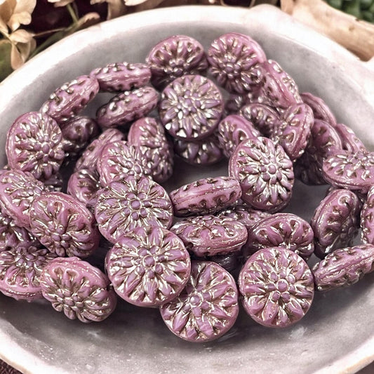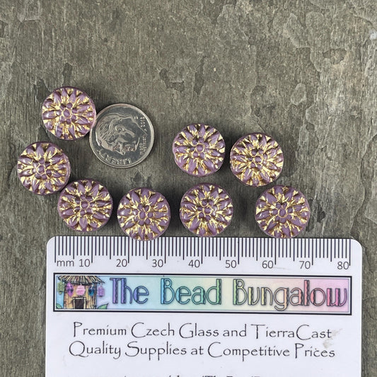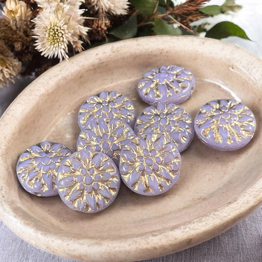 14mm Czech Glass Dahlia Flower Beads - Lilac Purple Opaline Flower with Gold Wash (FL14/RJ-5158) * Qty. 8