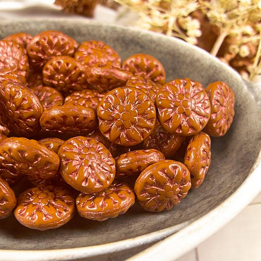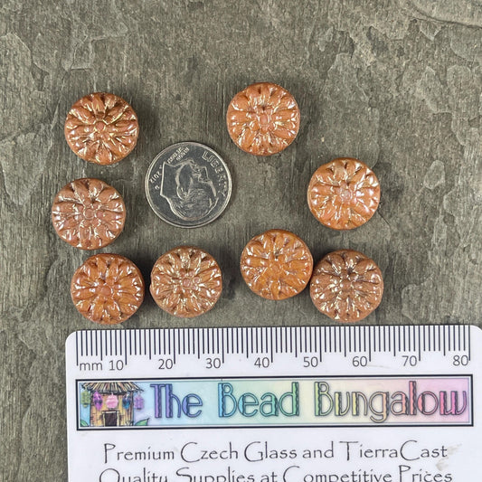 14mm Czech Glass Dahlia Flower Beads - Ochre Orange Flower with Copper Wash (FL14/RJ-5168) * Qty. 8