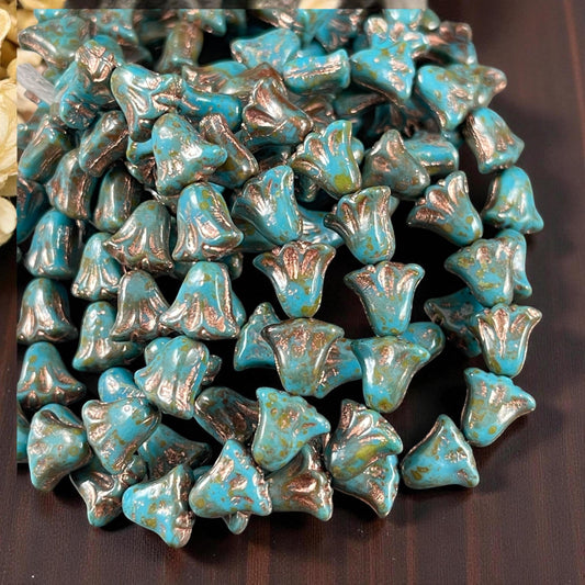 Czech Beads, 10mm Lily Flower, Sky Blue with Copper Wash (Lily/RJ-5496) * Qty. 15