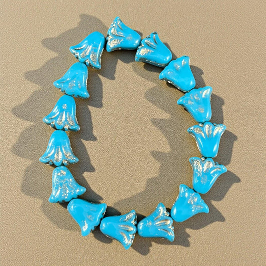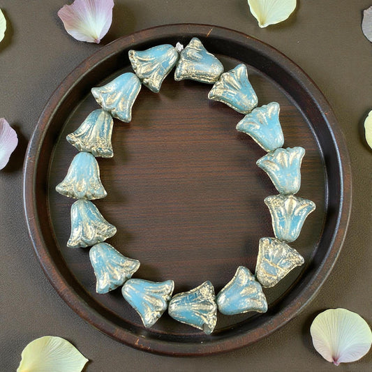 Czech Beads, 10mm Lily Flower, Aqua Blue Opaline with Gold Wash (Lily/RJ-5492) * Qty. 15