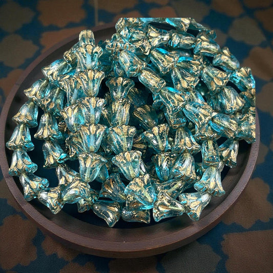Czech Beads, 10mm Lily Flower, Transparent Aqua with Gold Wash (Lily/RJ-5490) * Qty. 15
