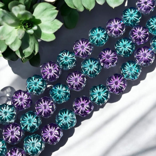 10mm Czech Glass Beads, Plum and Aqua Hibiscus, Purple and Blue/Green Glass Flower(PHib12) * Qty. 12