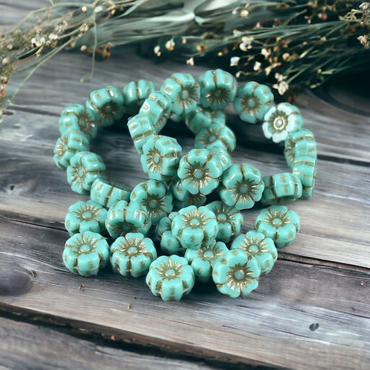 Czech Glass Beads - 12mm Opaque Turquoise Hibiscus Flower Beads ~ Dark Turquoise Glass with Gold Wash (FL12/RJ-1164) * Qty. 6