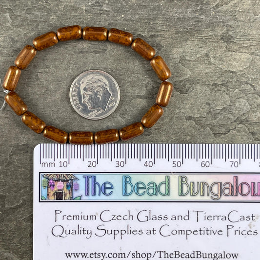 Czech Glass Beads - Dark Orange and Bronze 9x5mm Tube Bead, Burnt Orange with Bronze Picasso (TBE/N-2107) * Qty. 16