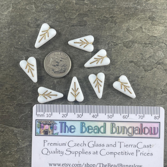 Czech Glass Beads, 16x11mm Elongated Heart Shape Beads, White with Antiqued Gold Wash (PHL10) * Qty. 8