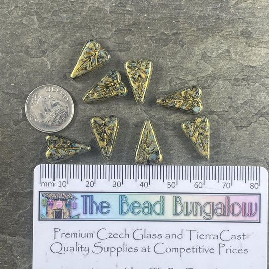 Czech Glass Beads, 16x11mm Elongated Heart Shape Beads, Black with Travertine and Heavy Gold Picasso Finishes (PHL8) * Qty. 8